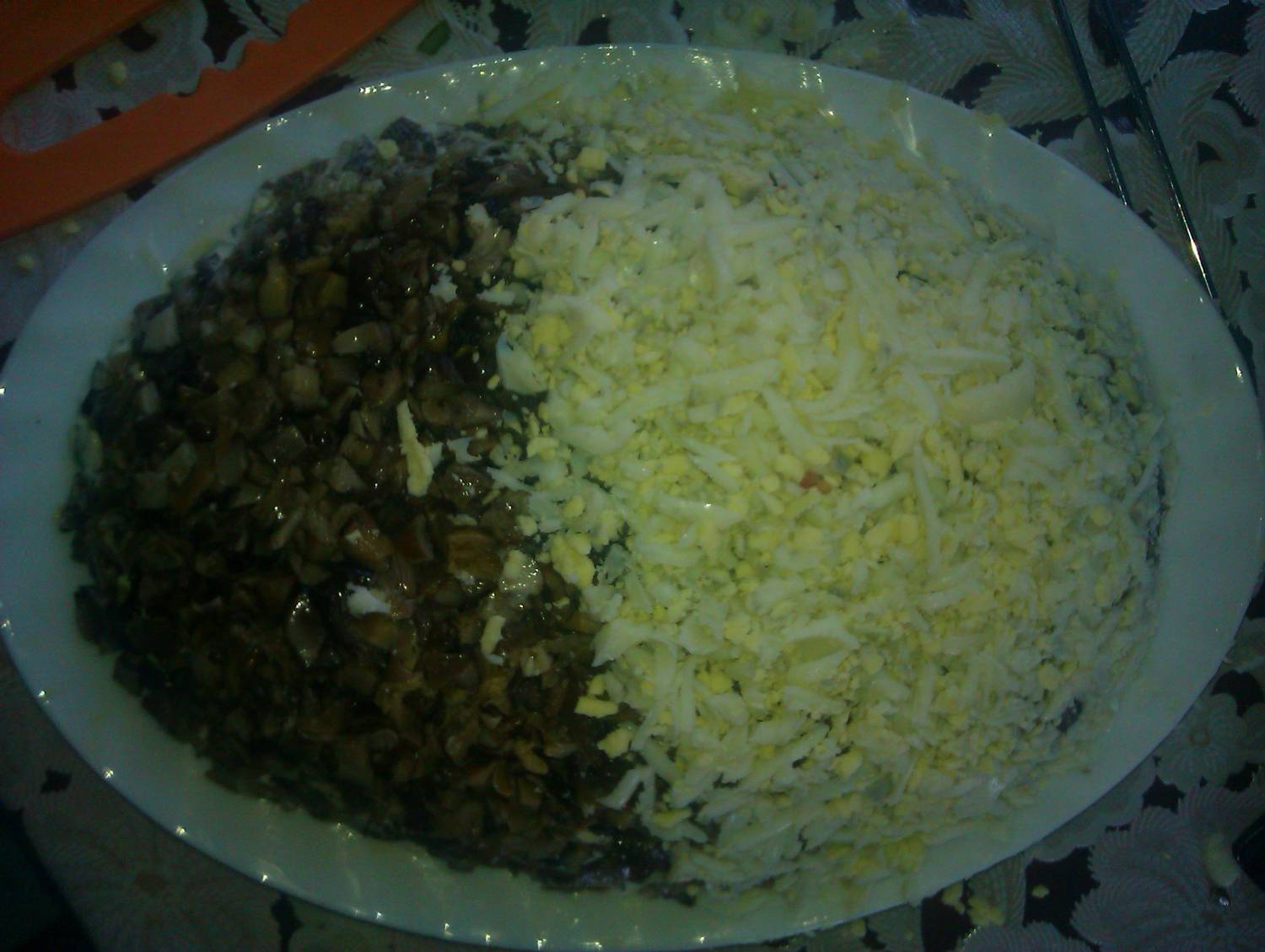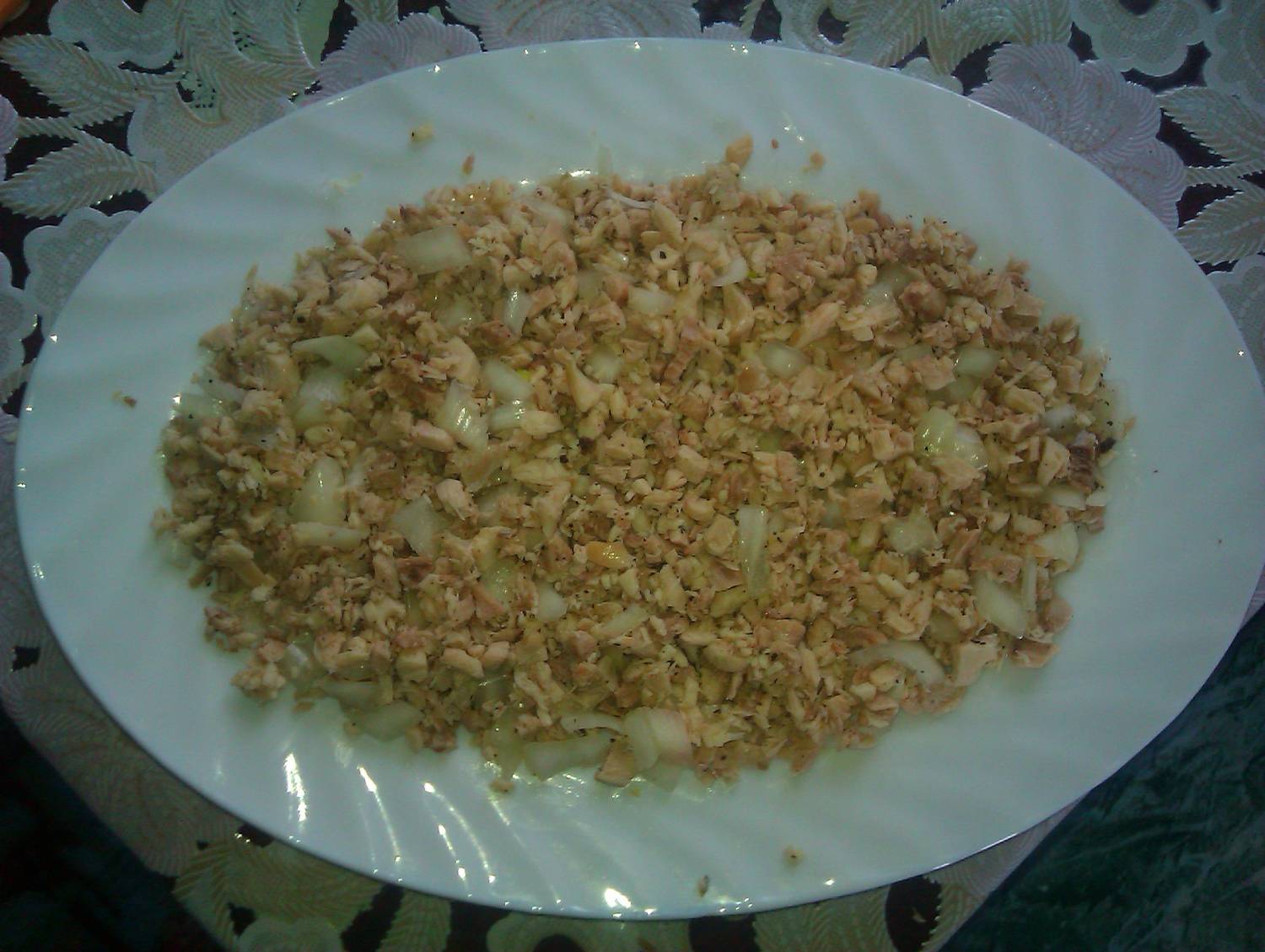 Отварную курятину мелко шинкуем, добавляем лук, солим - перчим, перемешиваем - это будет 1 слой.