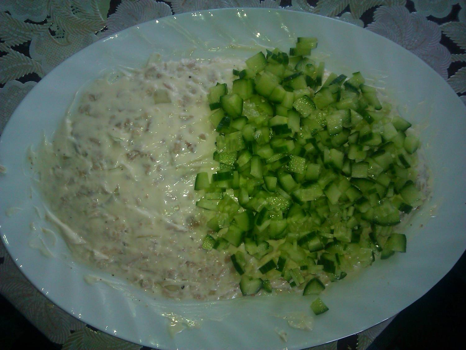 Смешать с подготовленной нарезанной начинкой для рыбы(огурец и перец красный оставляем и не смешиваем с майонезом).