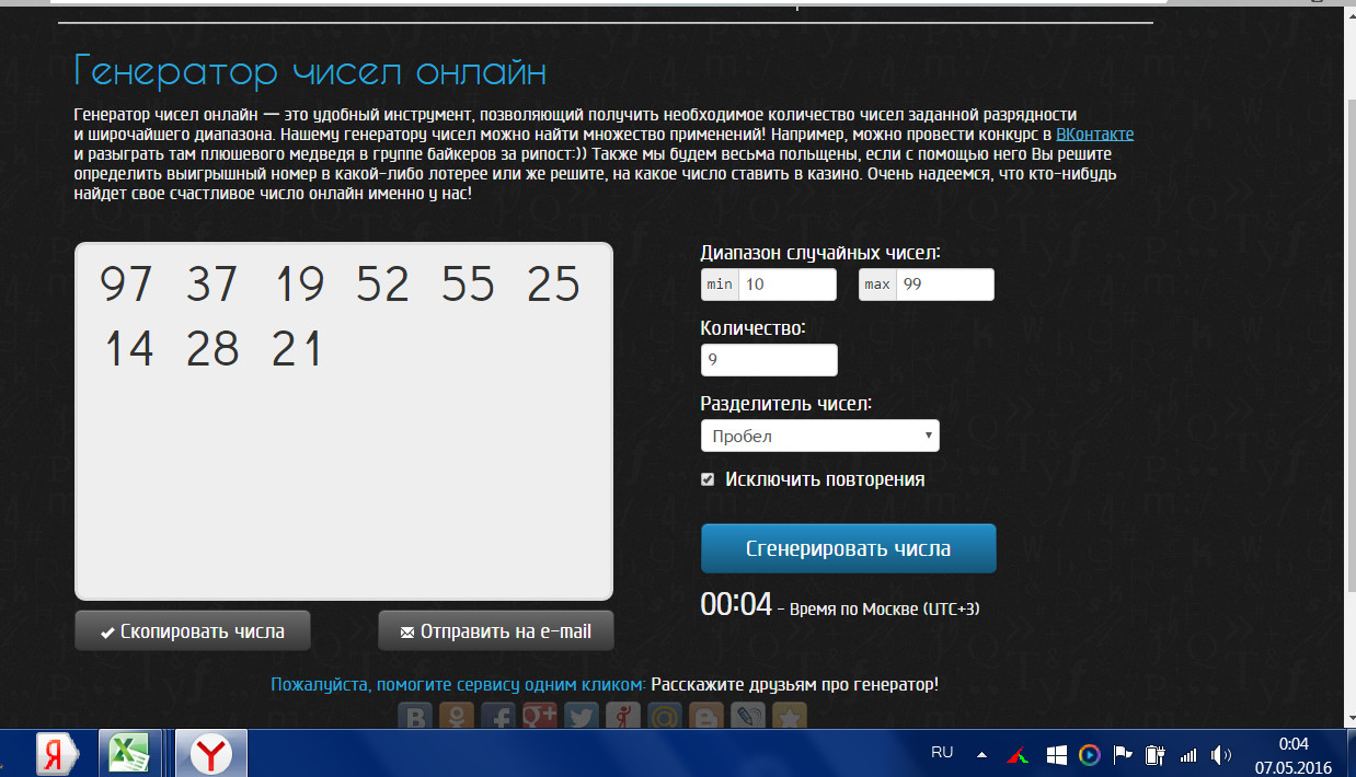 Каждую неделю или раз в две недели (зависит от активности пользователей) я буду генерировать 9 двузначных чисел и выкладывать на сайте скриншот с этими числами.