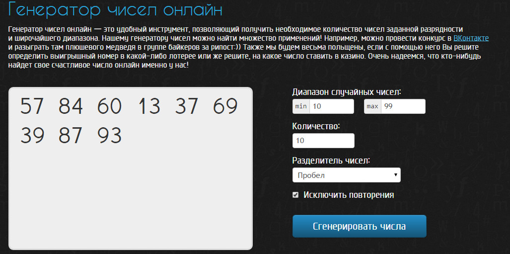 Поэтому наткнувшись на генератор чисел с возможностью выбора: диапазона чисел, количества, быть повторениям или нет.